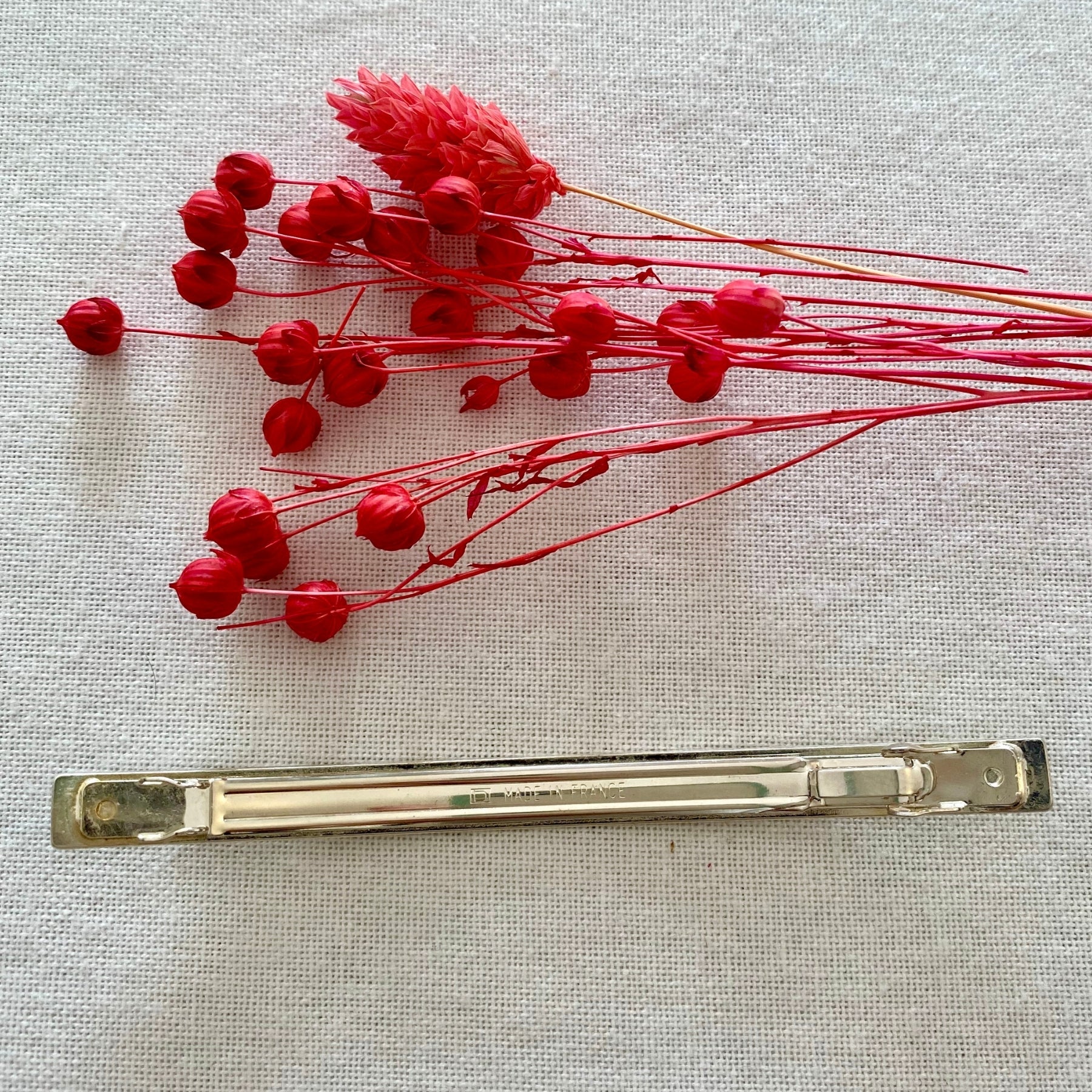 Adeline, avec son joli décor, est une barrette longue et fine qui permet de répartir les cheveux sur toute sa longueur. Elle mesure 11 cm de long et il est possible de l'attacher en demi-queue ou en queue basse. Elle apportera immédiatement féminité et style à votre coiffure.