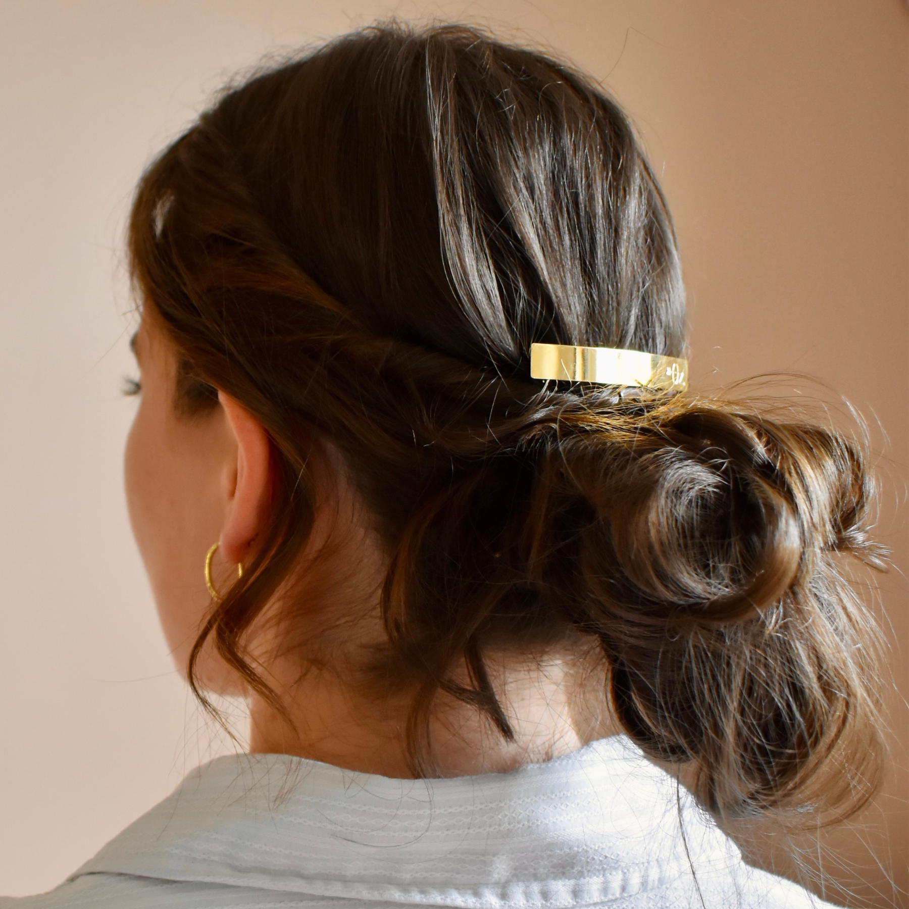 Chignon orné d'une barrette à cheveux dorée plate chic et tendance
